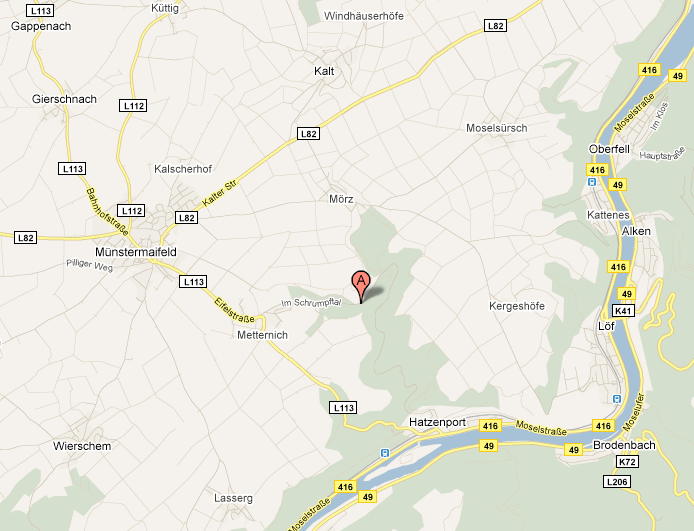 Fahren Sie den Wegweisern nach Richtung Hatzenport aus Münstermaifeld heraus. Nach einer etwa 1 km langen geraden Strecke erreichen Sie den Ortsteil Metternich. Kurz hinter dem Ortseingang geht eine schmale Fahrstraße links ab "zu den Schrumpftal-Mühlen". Folgen Sie dieser Straße nochmal etwa 1 km, bis Sie unser Haus auf der rechten Seite sehen.